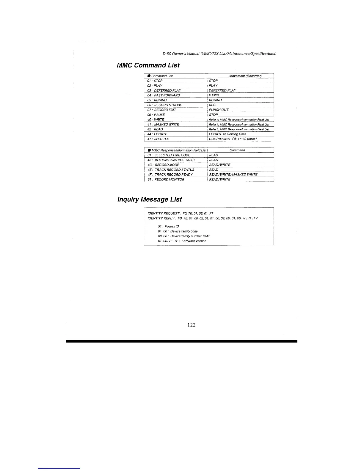 Fostex D-80 - MMC Command List; Inquiry Message List