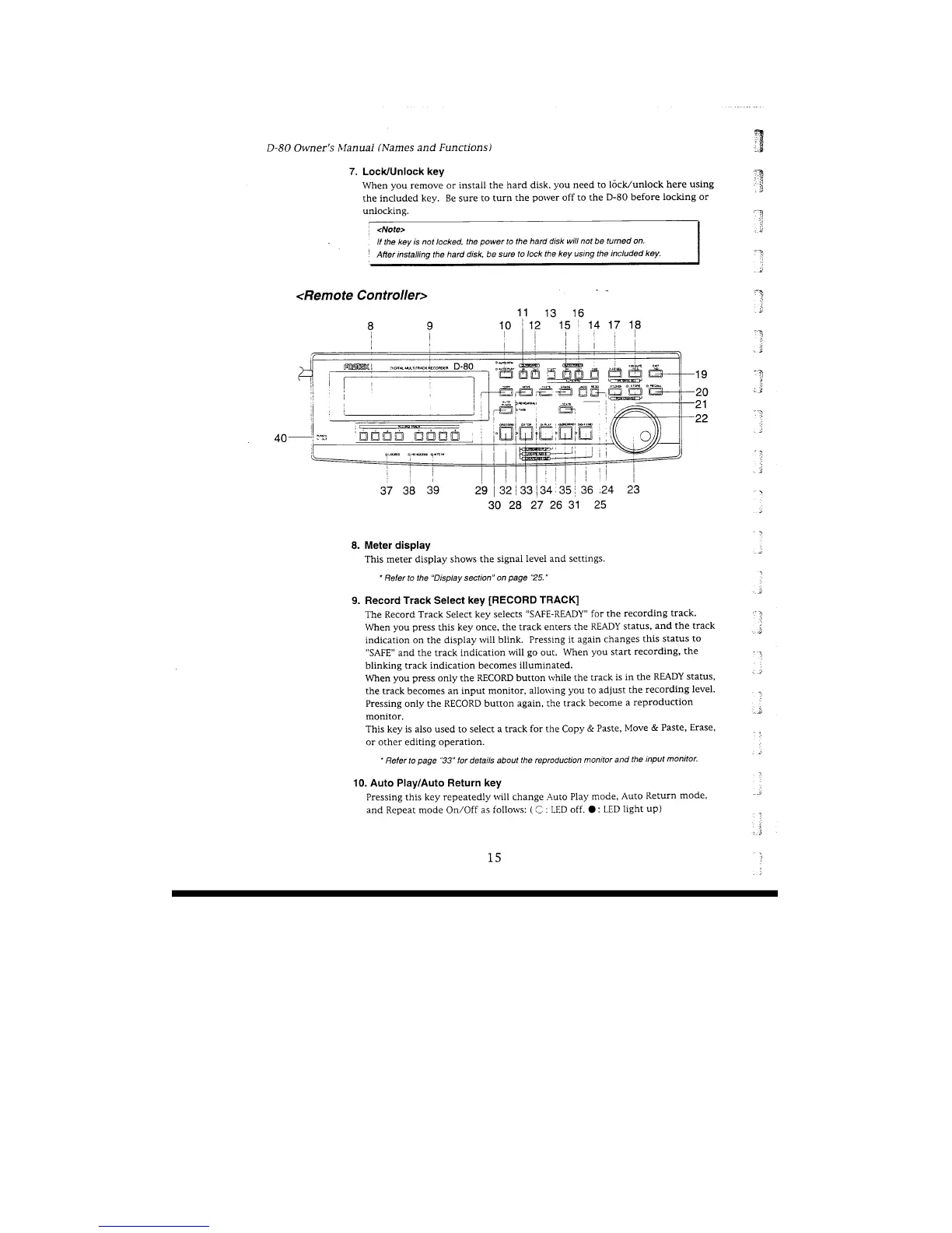 Fostex D-80 - Remote Controller; Lock;Unlock Key; Record Track Select Key (Record Track); Auto Play;Auto Return Key
