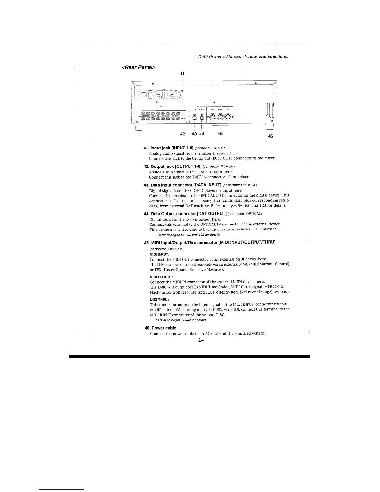 Fostex D-80 - Rear Panel; Data Input Conector; Data Output Connector; MIDI Input;Output;Thru Connector