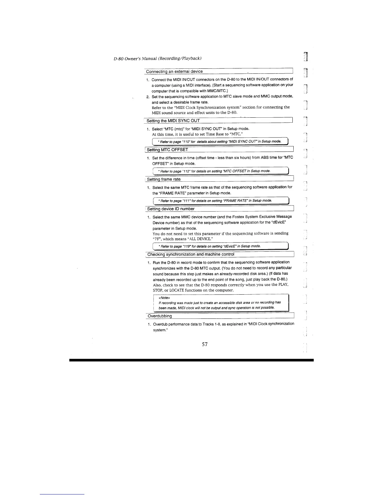 Fostex D-80 - Connecting an External Device; Setting the MIDI Sync out; Setting Frame Rate; Setting Device ID Number;Checking Synchronization and Machine Control