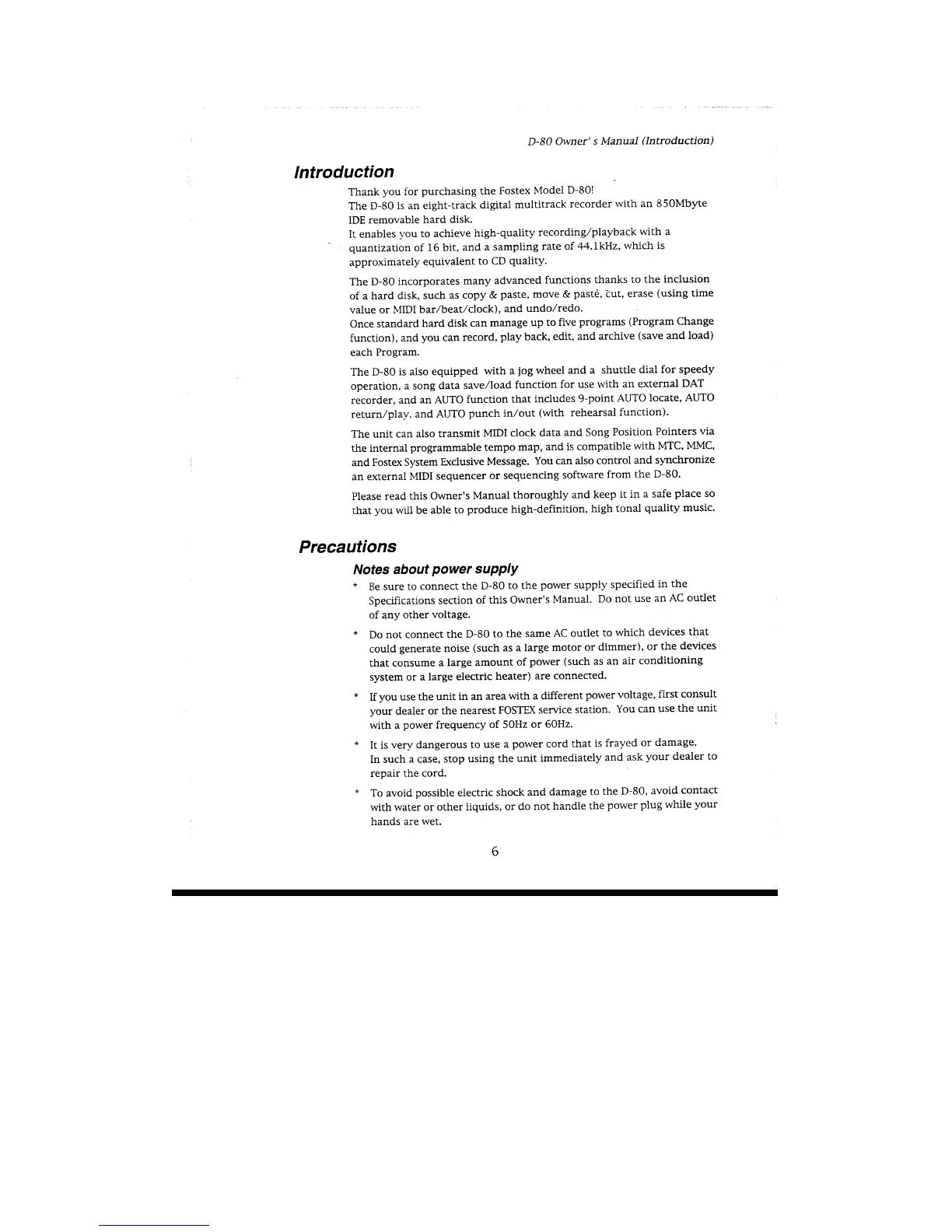Fostex D-80 - Notes About Power Supply; Notes on Handling the Hard Disk