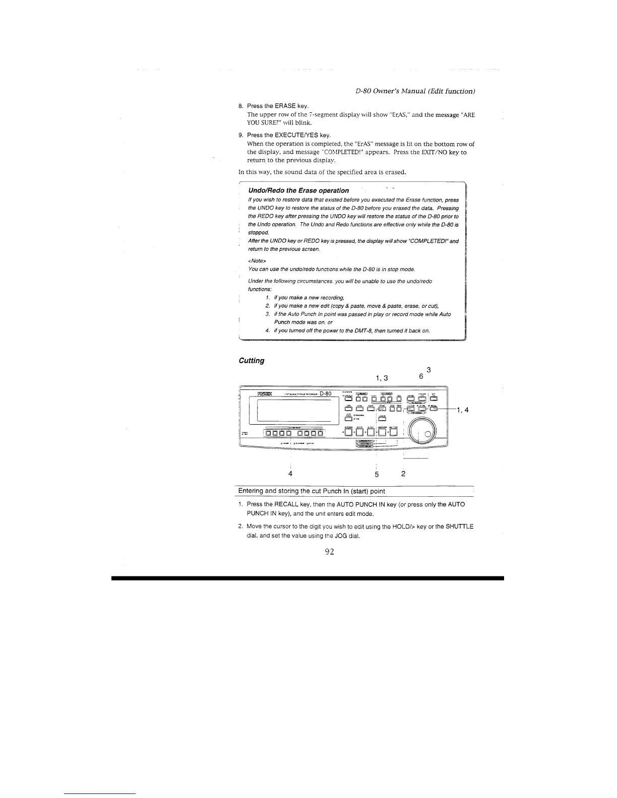 Fostex D-80 - Undo;Redo the Erase Operation; Cutting; Entering and Storing the Cut Punch in (Start) Point