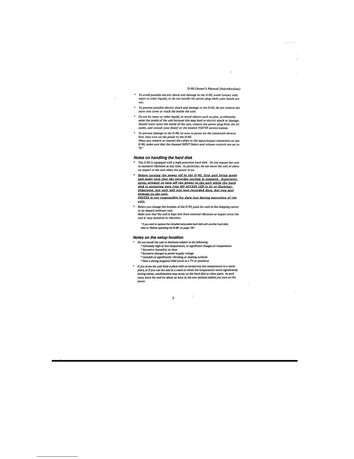 Fostex D-90 - Notes on Handling the Hard Disk; Notes on the Setup Location