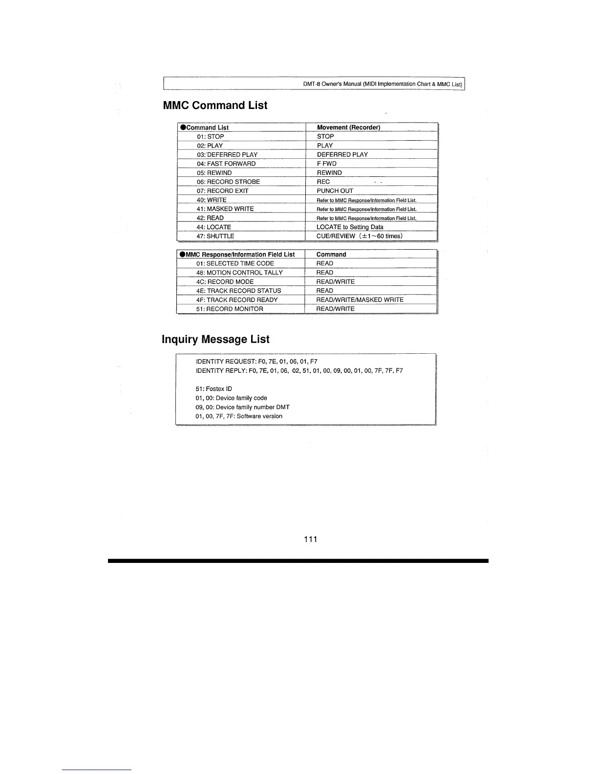 Fostex DMT-8 - MMC Command List; Inquiry Message List
