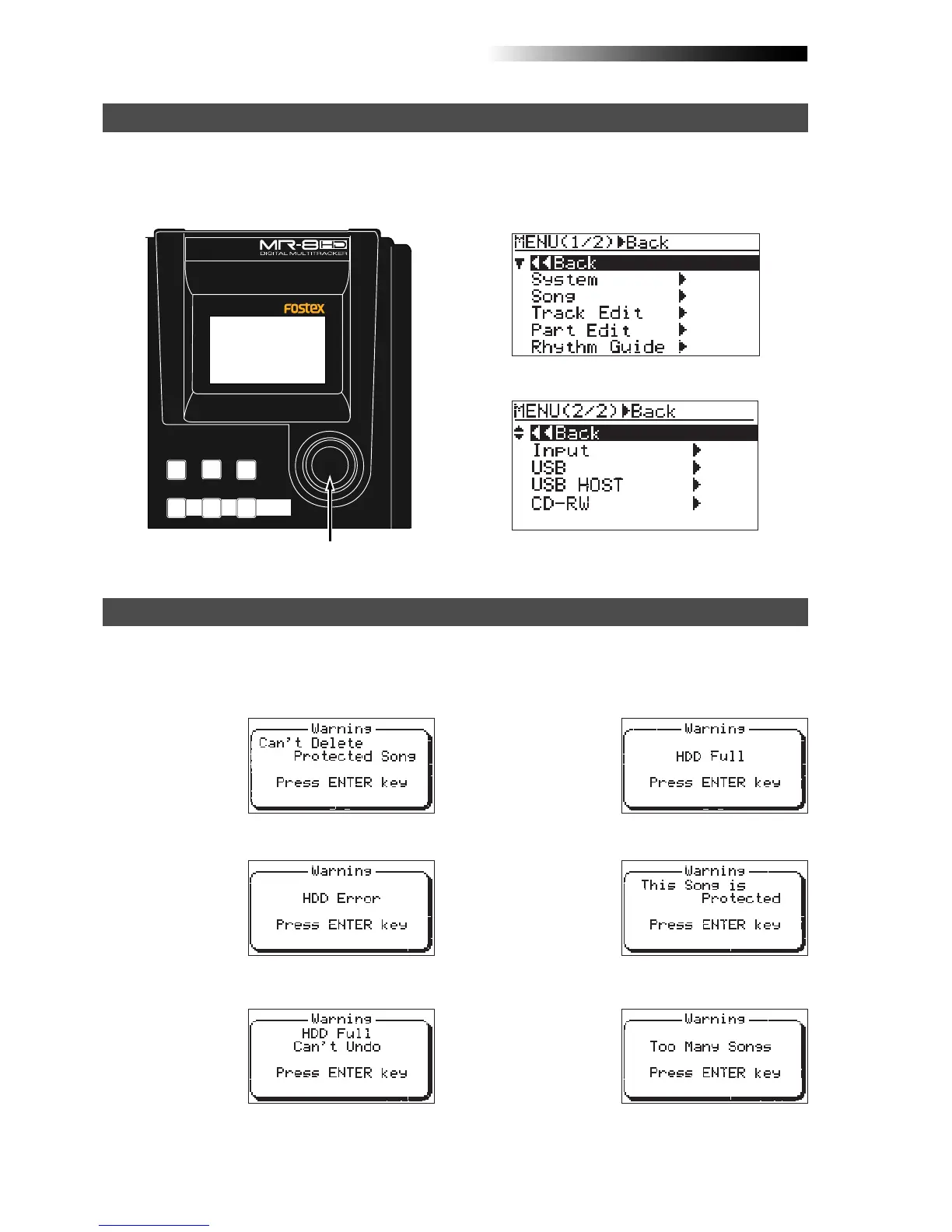 shown on the display. Most warning messages are being shown until the [MENU/ENTER] knob is pressed.