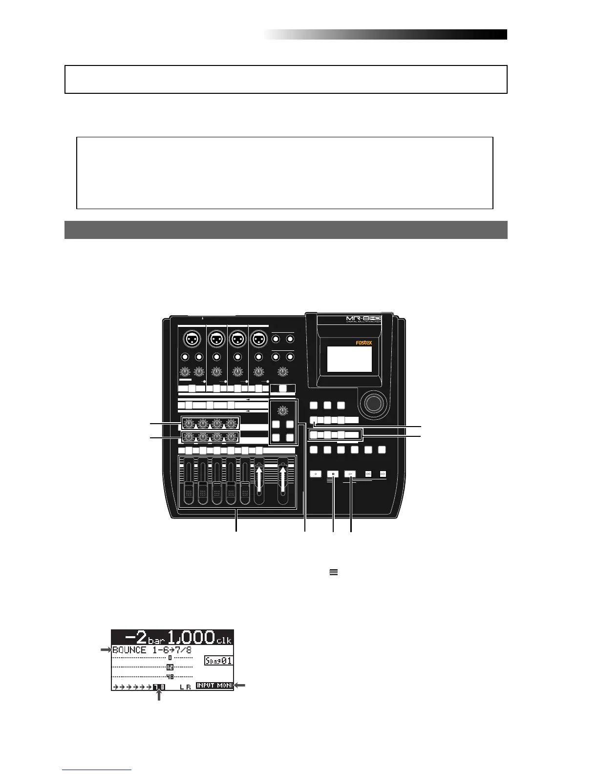 As described earlier in "Bouncing tracks 1 through 4 to tracks 5/6", you can rehearse track bouncing