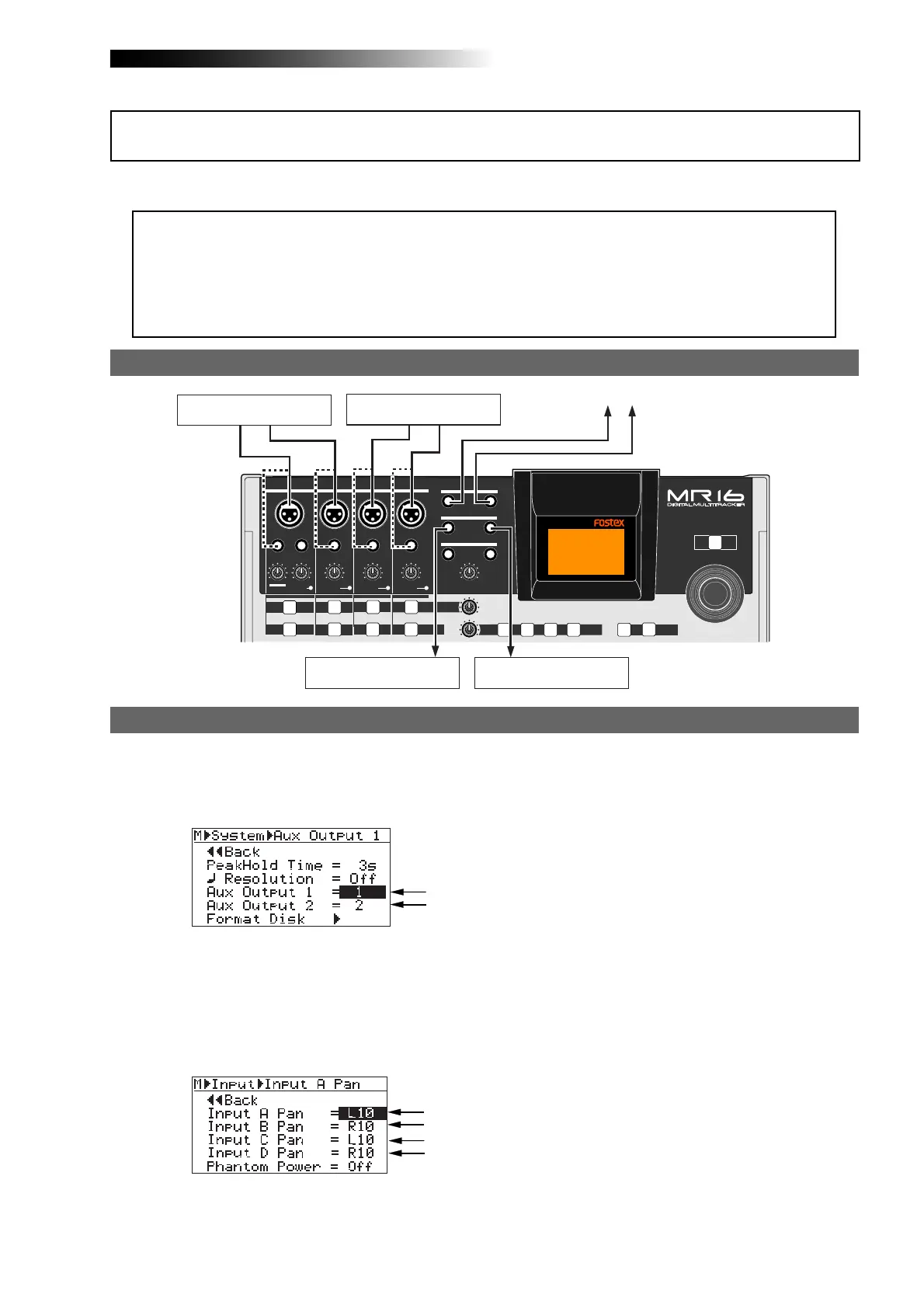 As example 1, this example also uses the AUX OUT and TO STEREO BUSS functions. It is assumed