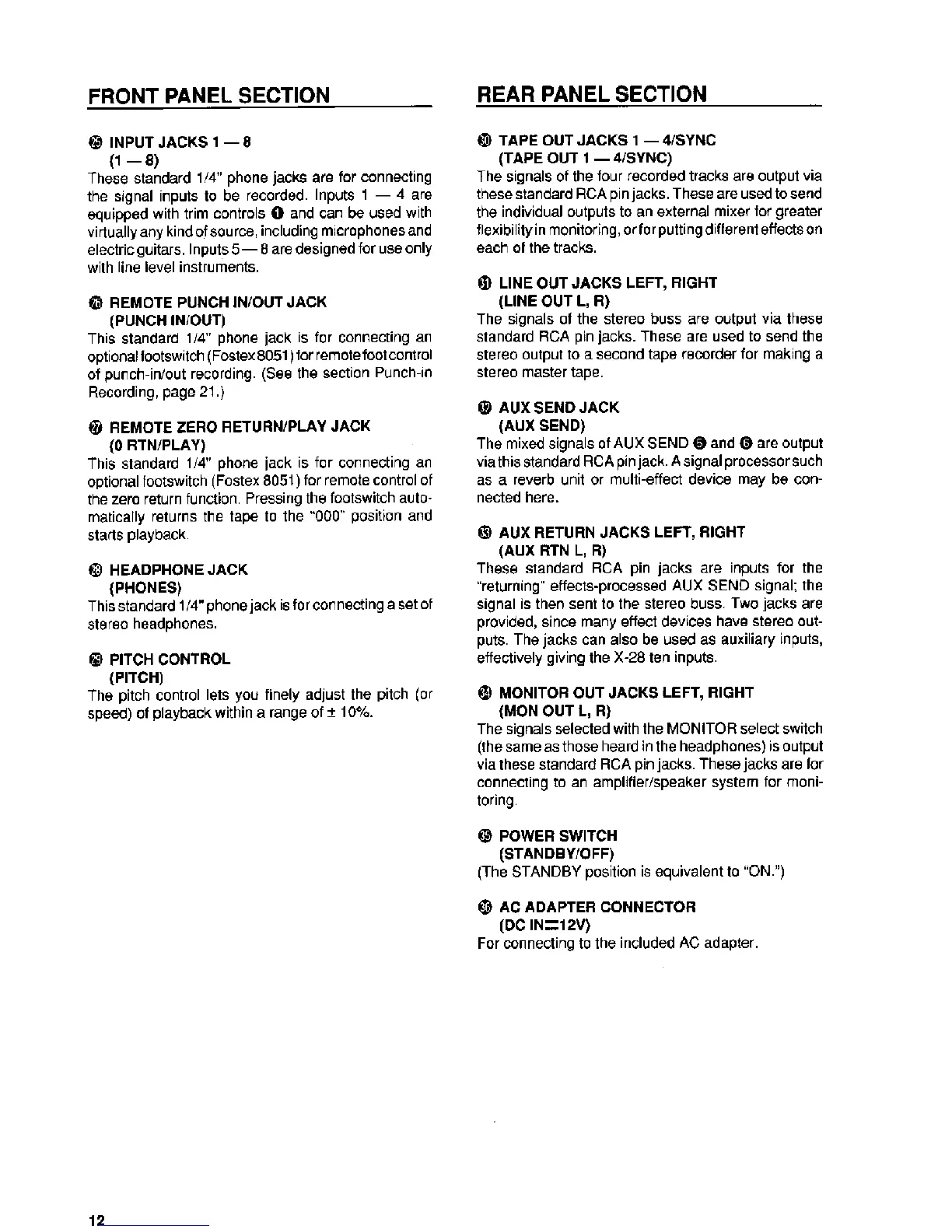 Fostex MULTITRACKER X-28 - FRONT AND REAR PANEL SECTIONS