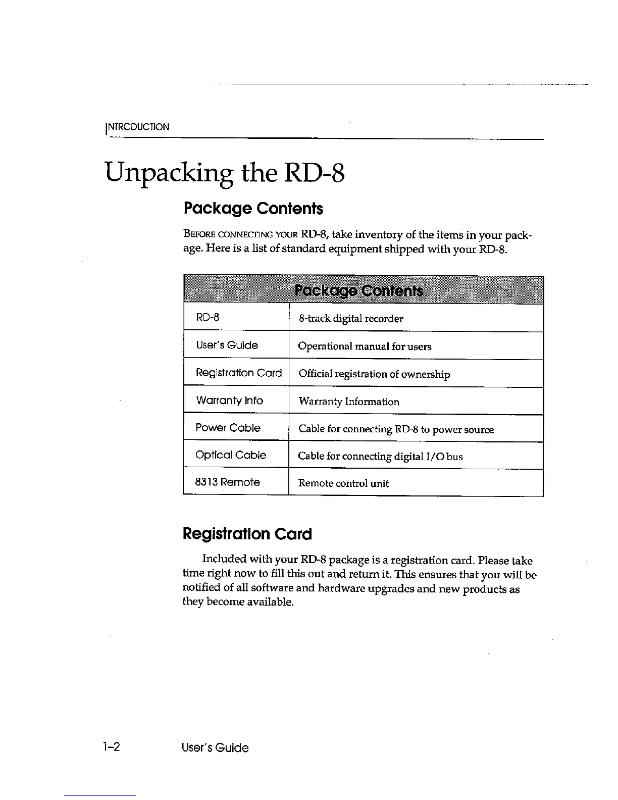 Fostex RD-8 - Unpacking the RD-8; Package Contents; Registration Card