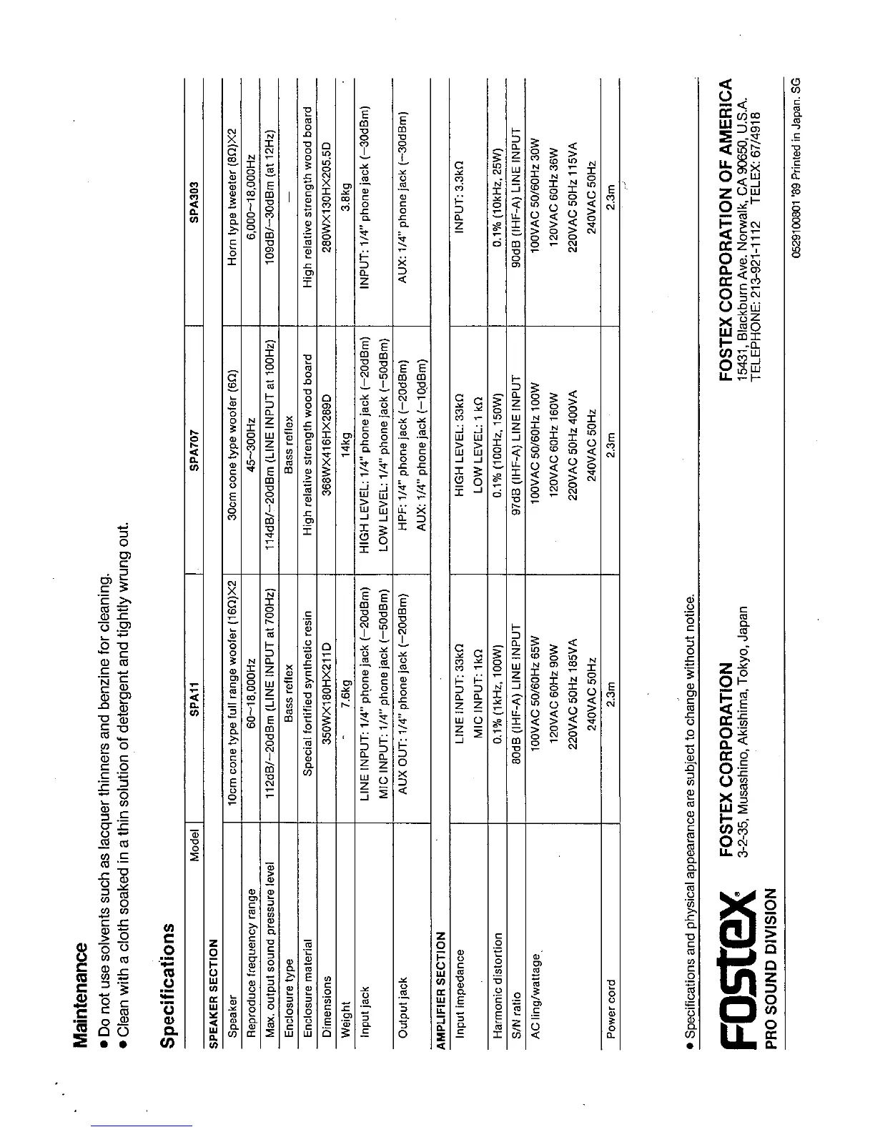 Fostex SPA11 - Specifications; Speaker Section Specifications; Amplifier Section Specifications