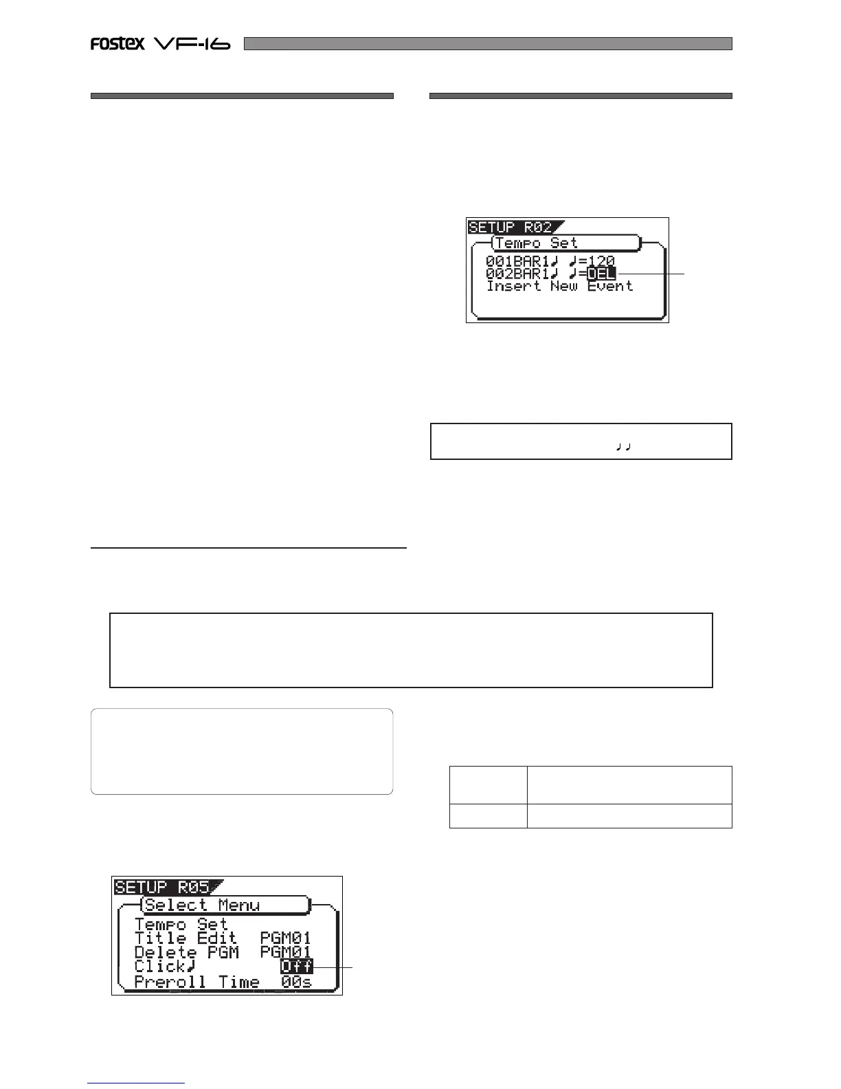 “Setting the Metronome function” menu allows you to determine whether or not the VF-16 outputs a metronome