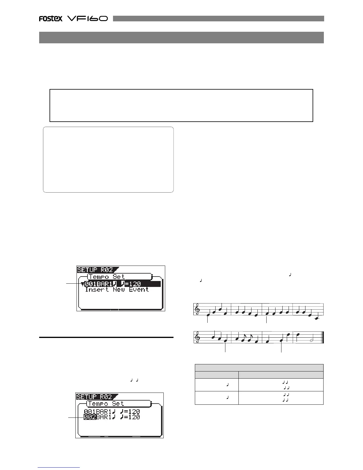 Time signature and tempo settings make a Tempo Map, which is used by the VF160 to manage the song using the BAR/