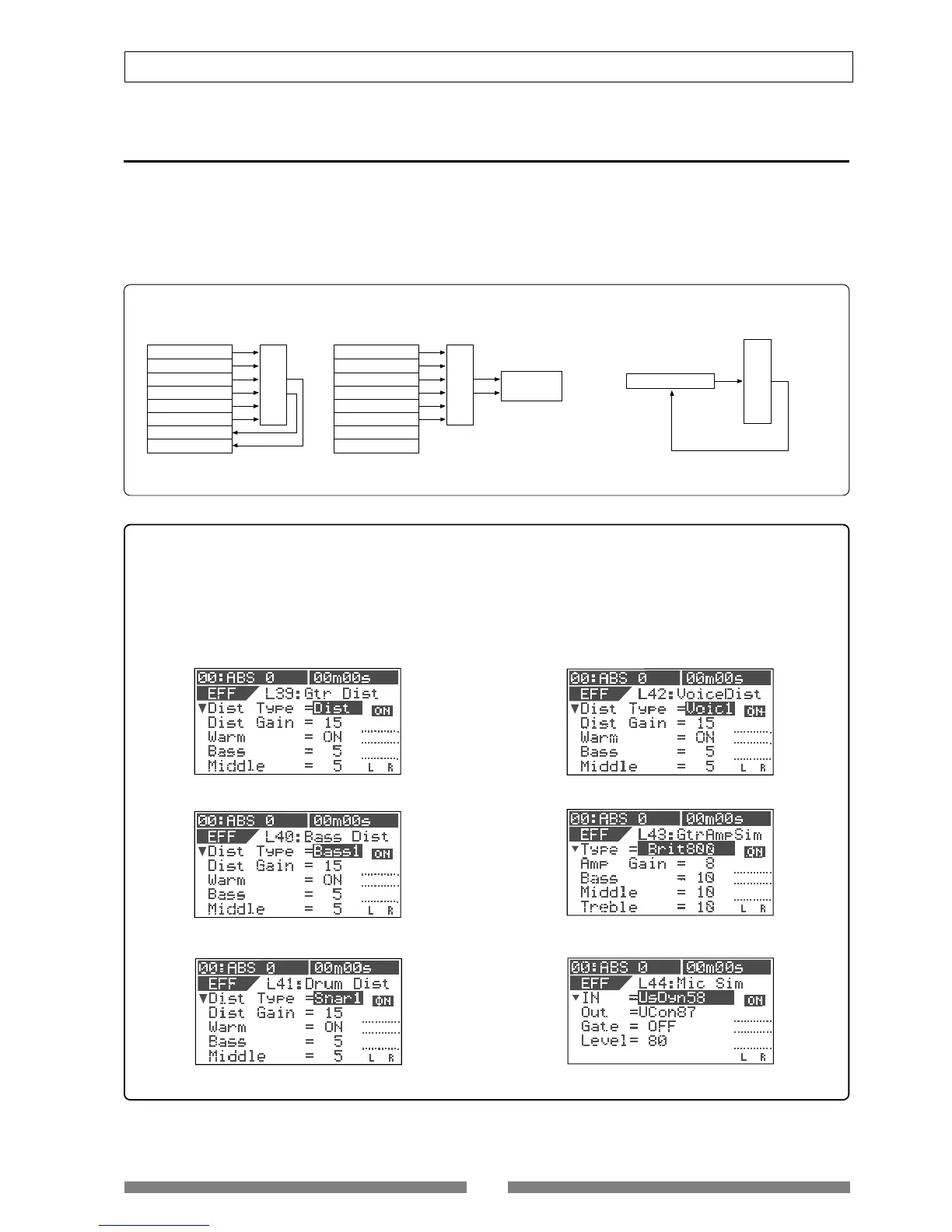 Six distortion/simulation type effects are available for the insert effect. You can distort a guitar,