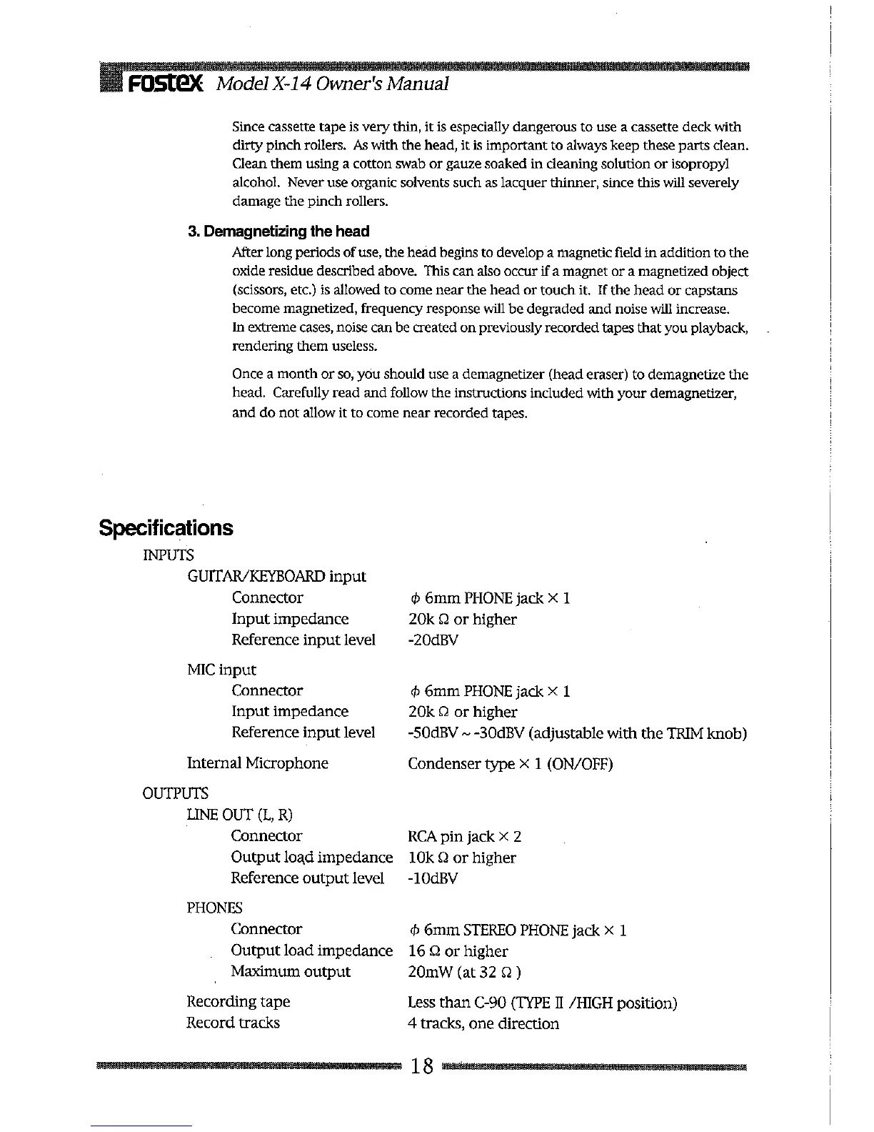 Fostex X-14 - Maintenance and Specifications; Demagnetizing the Head; Technical Specifications