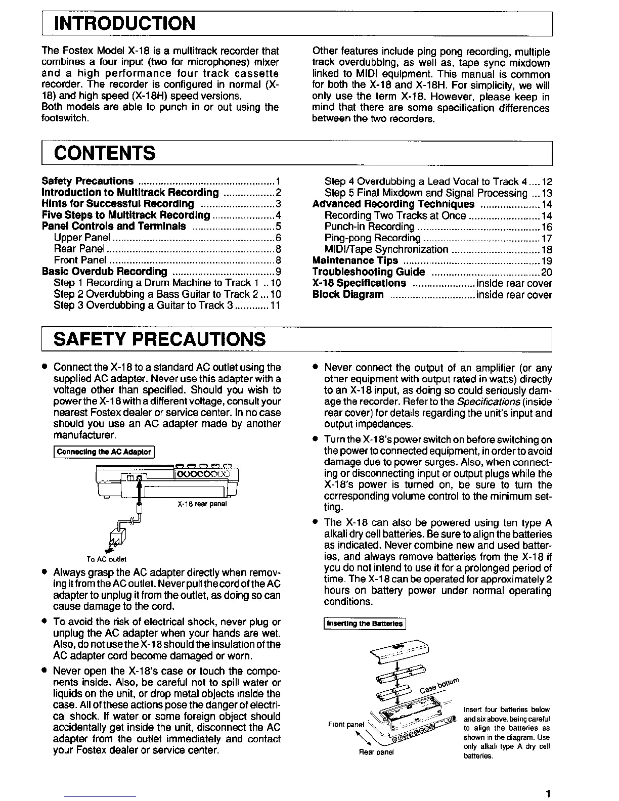 Fostex X-18H - Product Introduction and Power Safety; AC Adapter and Battery Operation Safety; Internal Component and Liquid Warning