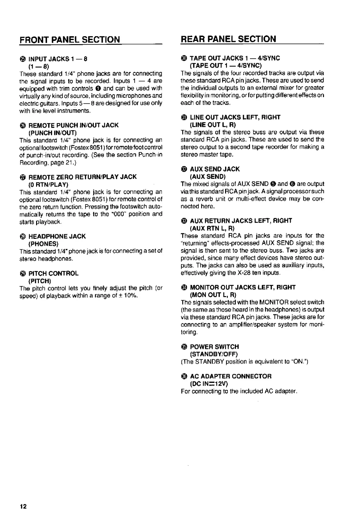 Fostex X-28 - Front and Rear Panel Sections; Front Panel Inputs and Controls; Rear Panel Connections