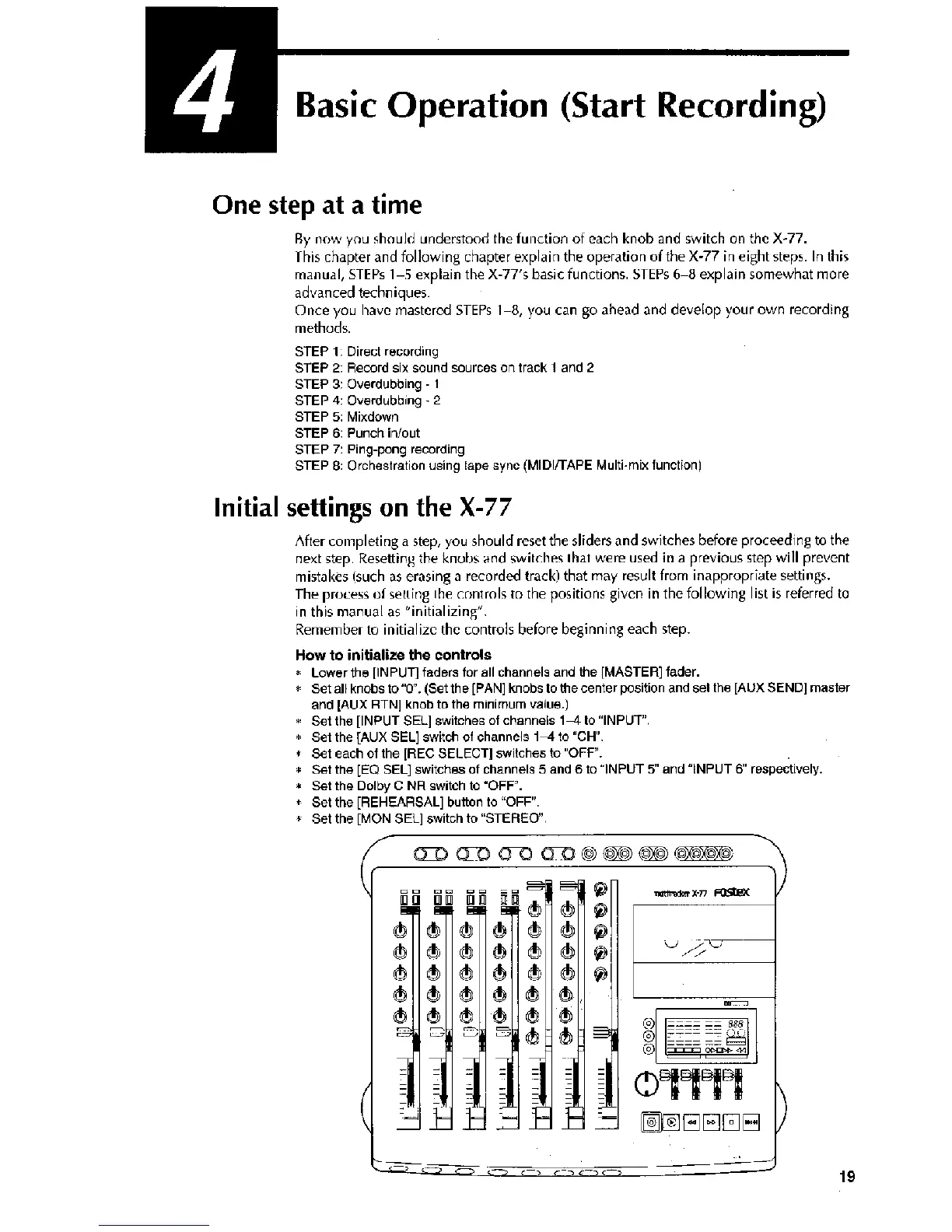 Fostex X-77 - Basic Operation (Start Recording); One Step at a Time; Initial Settings; How to Initialize the Controls
