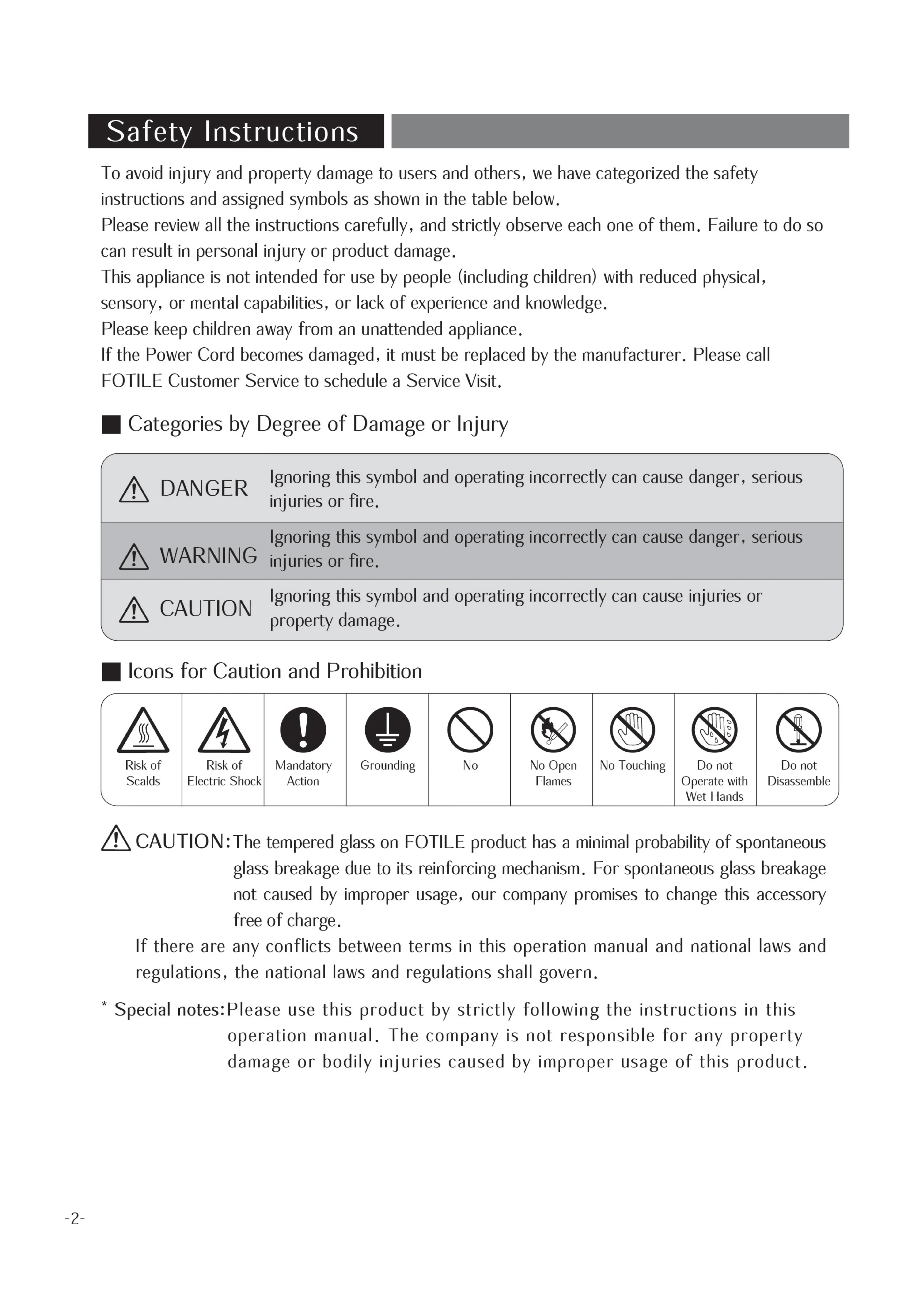 FOTILE SD2F-P3 - Safety Instructions; Categories by Degree of Damage or Injury; Icons for Caution and Prohibition
