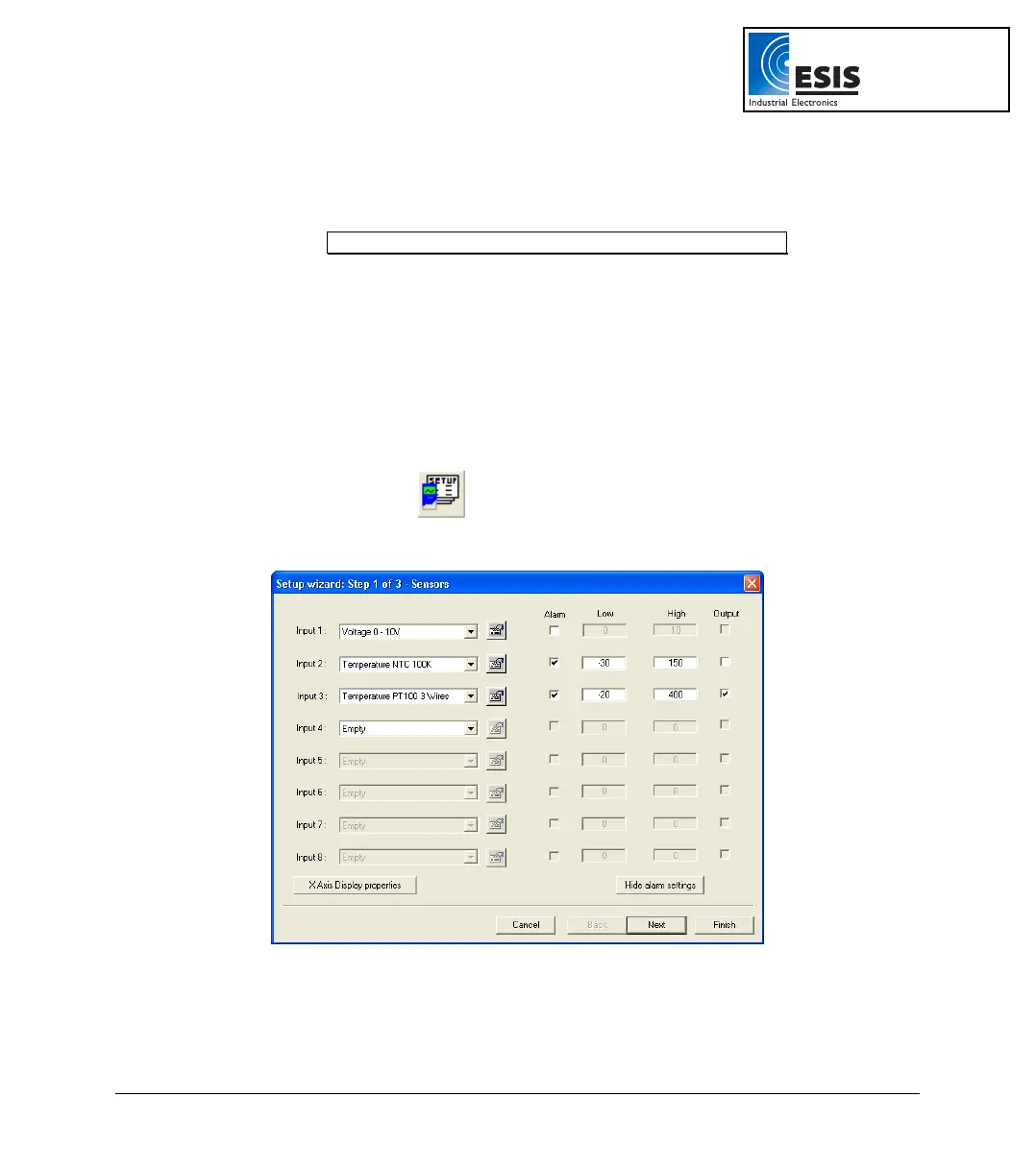 You can setup alarm levels and output for each sensor input individually in the first step of the Setup