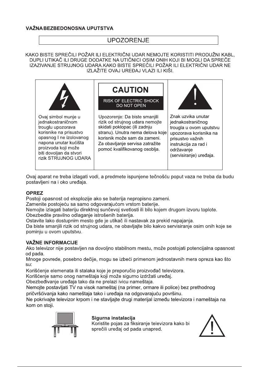 Nemojte postavljati TV na visok nameštaj (na primer, ormare ili police) bez prethodnog
