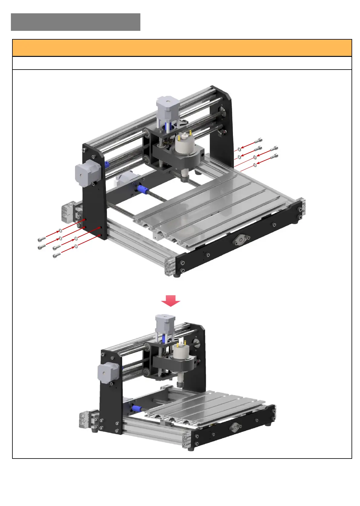 Step 2: Fix the gantry right next to the pads on the base with M5*14 bolts and gaskets.