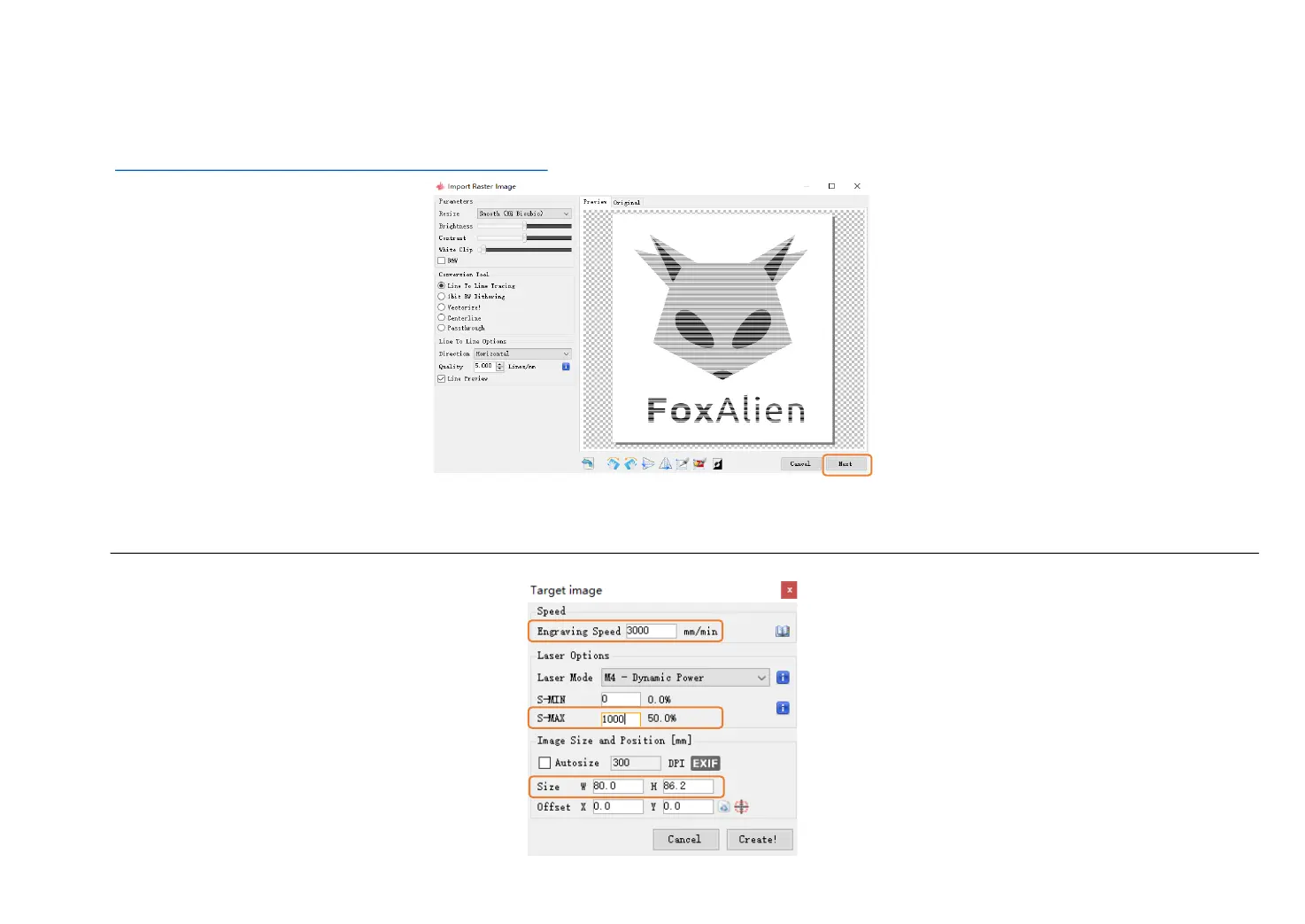 !! Note: Different materials require different engraving speed and S value. You may need to try several times to find appropriate value.