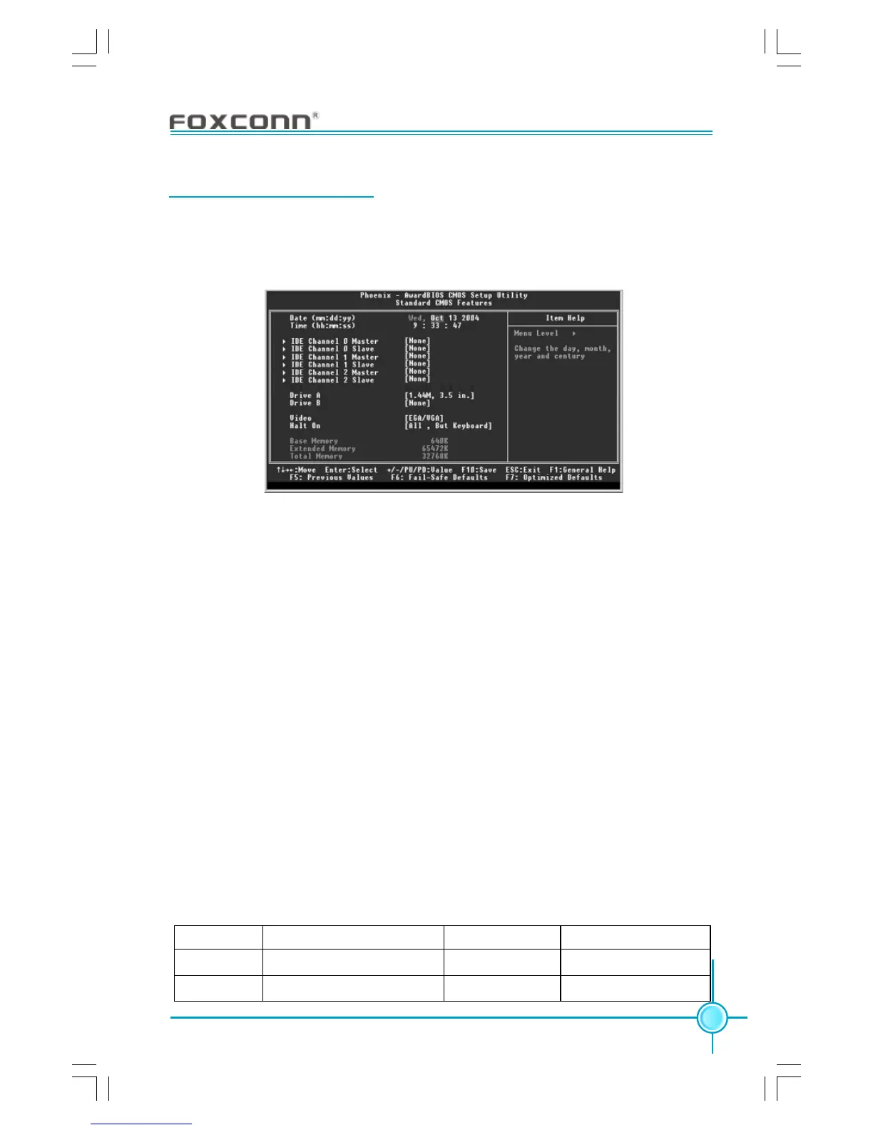 This sub-menu is used to set up the standard CMOS features, such as the date,