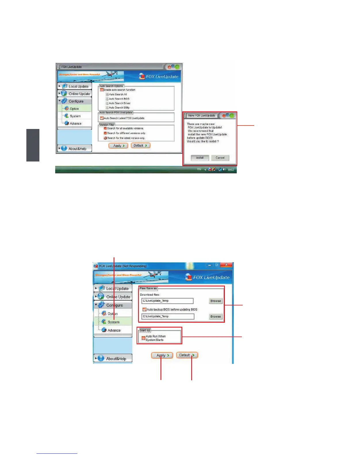 This page lets you set the location of download les and auto backup BIOS, determine if the FOX