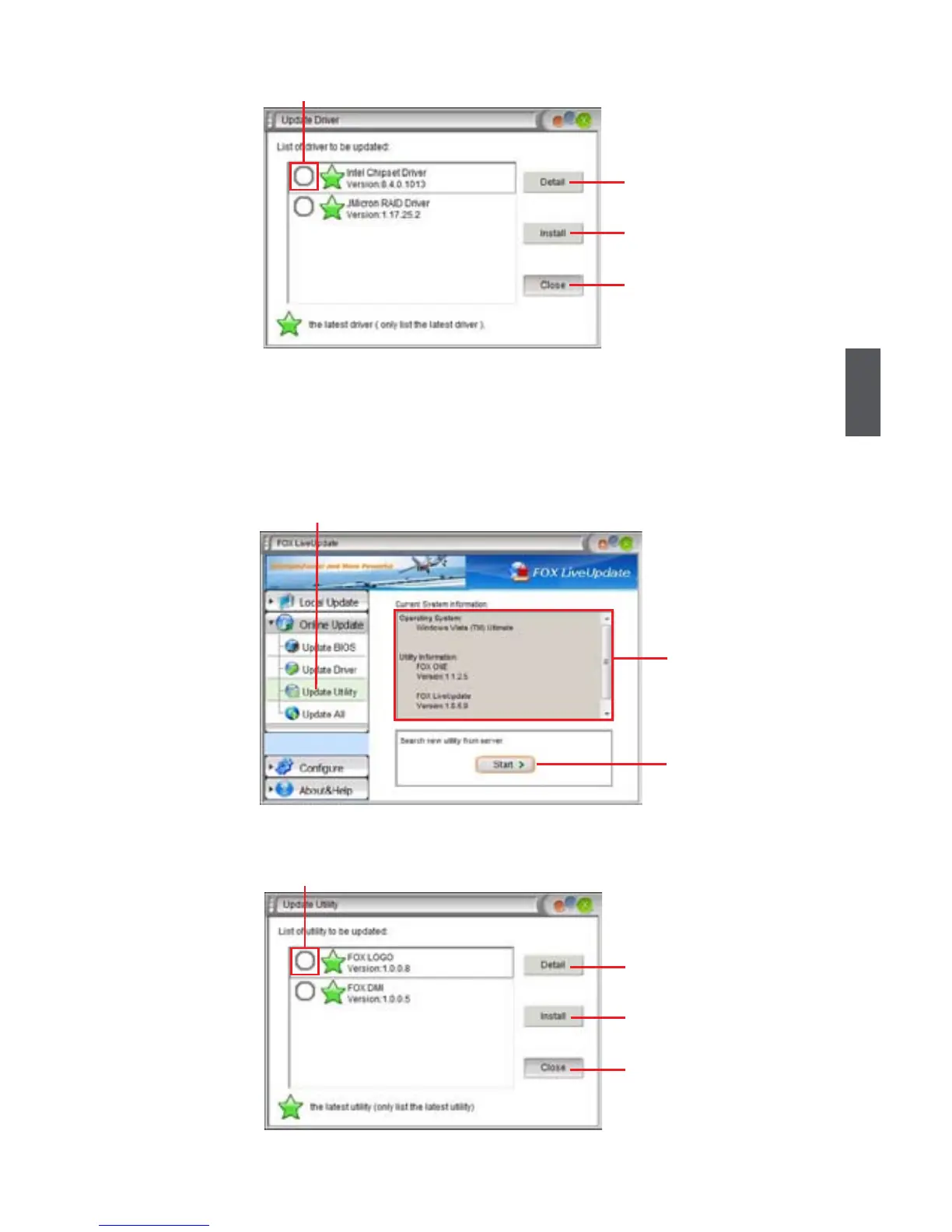 This page lets you update utilities from Internet. Click “start”, it will search the new utilities from