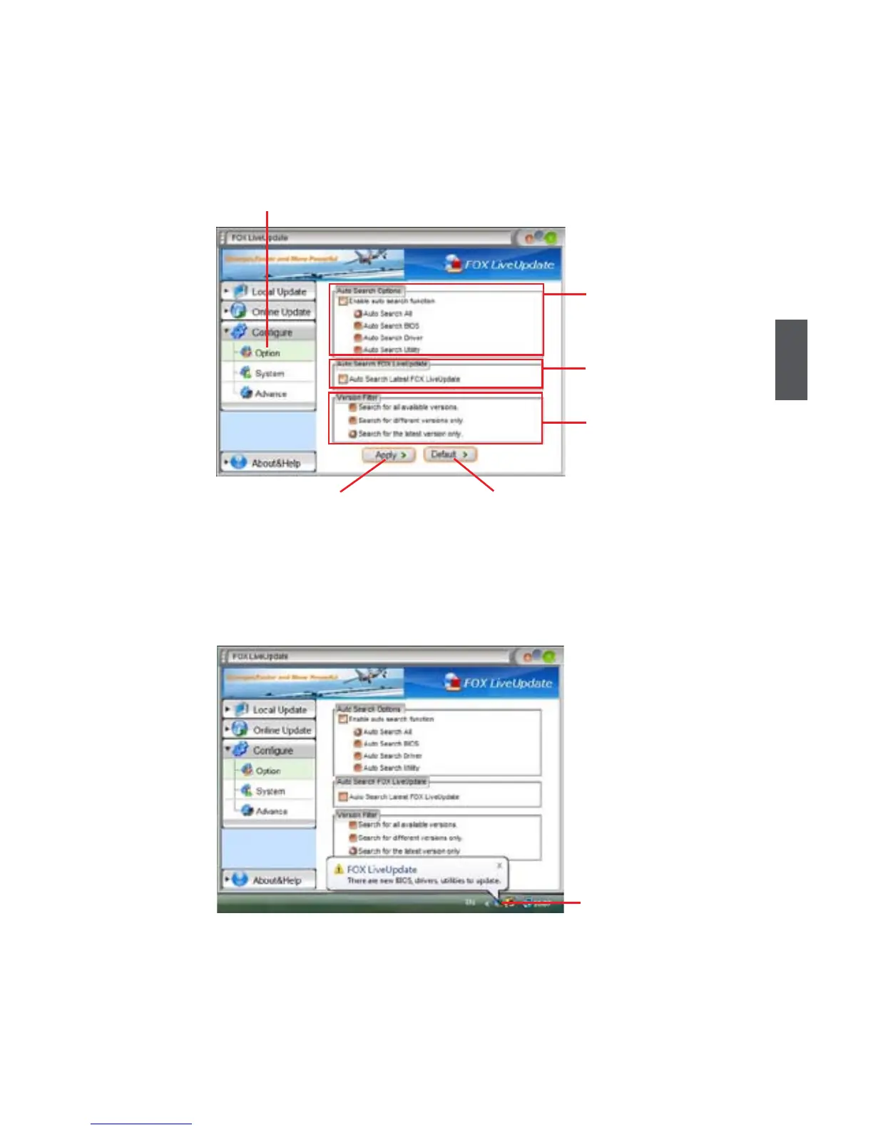 This page lets you set auto search options. After you enable the auto search function, FOX