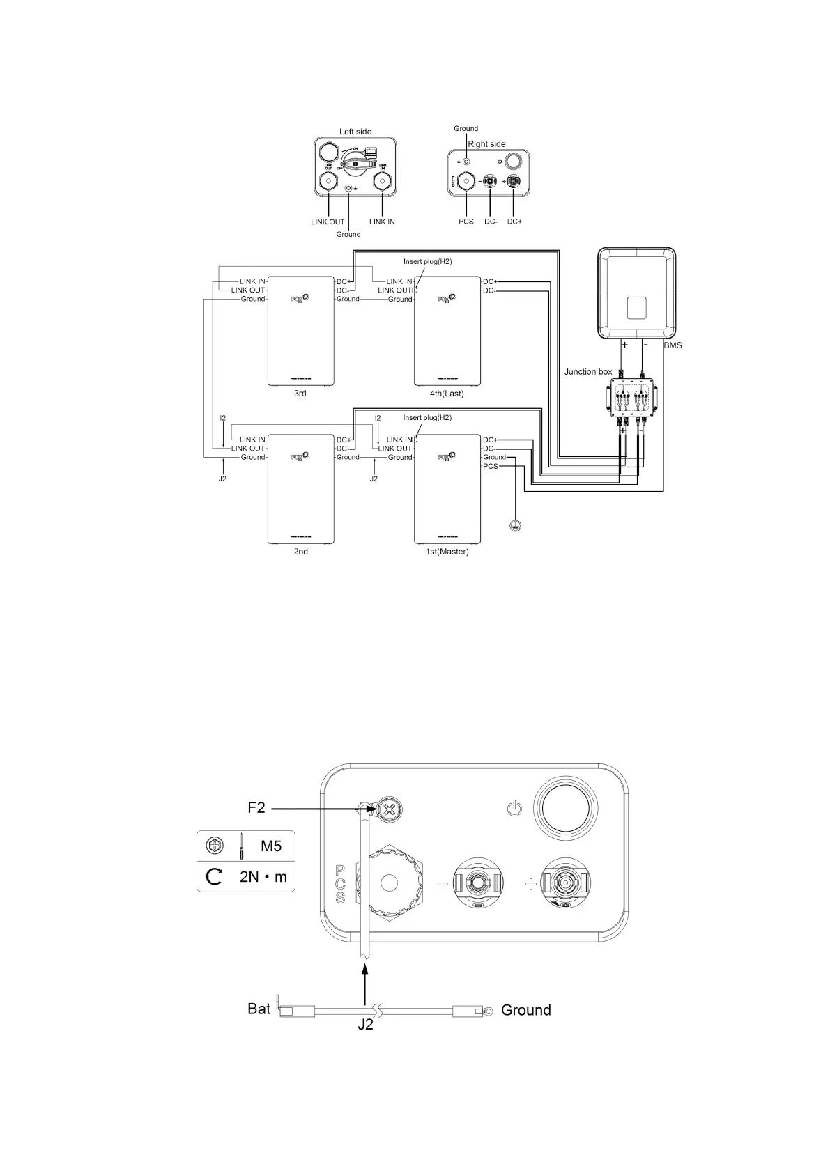 Keep a distance of 300-600mm from the battery to the junction box. Power cable(K2) must be pulled