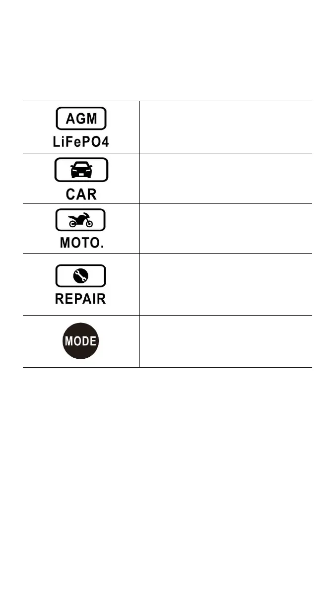 The Charger has seven (7) modes: 12V AGM+(LiFePo4), 24V AGM+(LiFePo4),