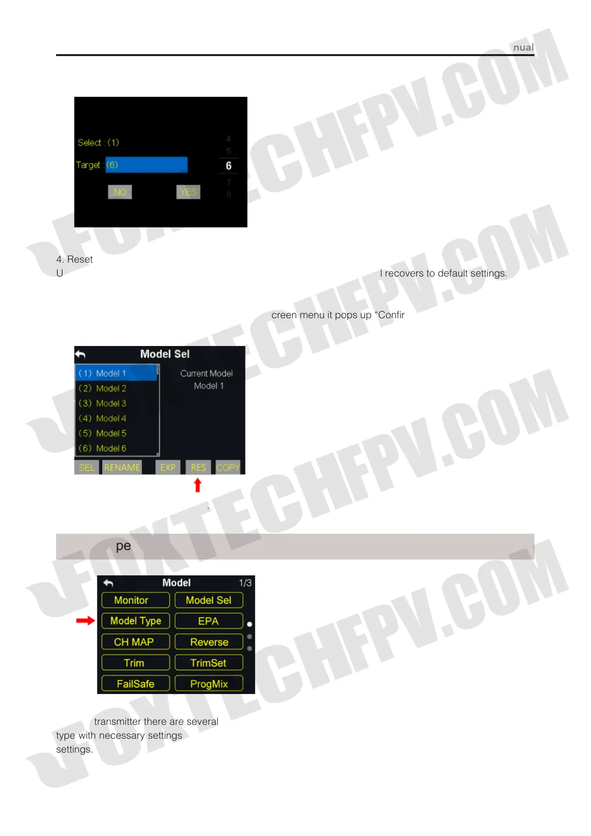 (1) Tap on your requiring model, then “RES”, in screen menu it pops up “Confirm to reset the model” dialog;