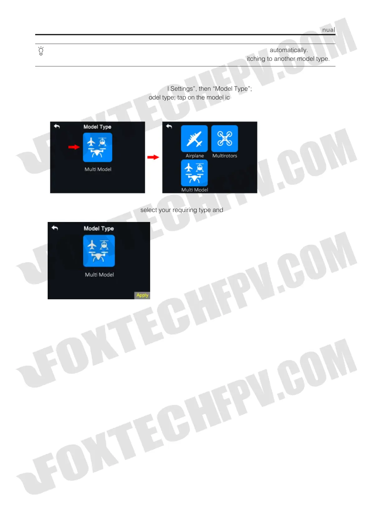 (1) In “transmitter settings” menu, tap on “Model Settings”, then “Model Type”;