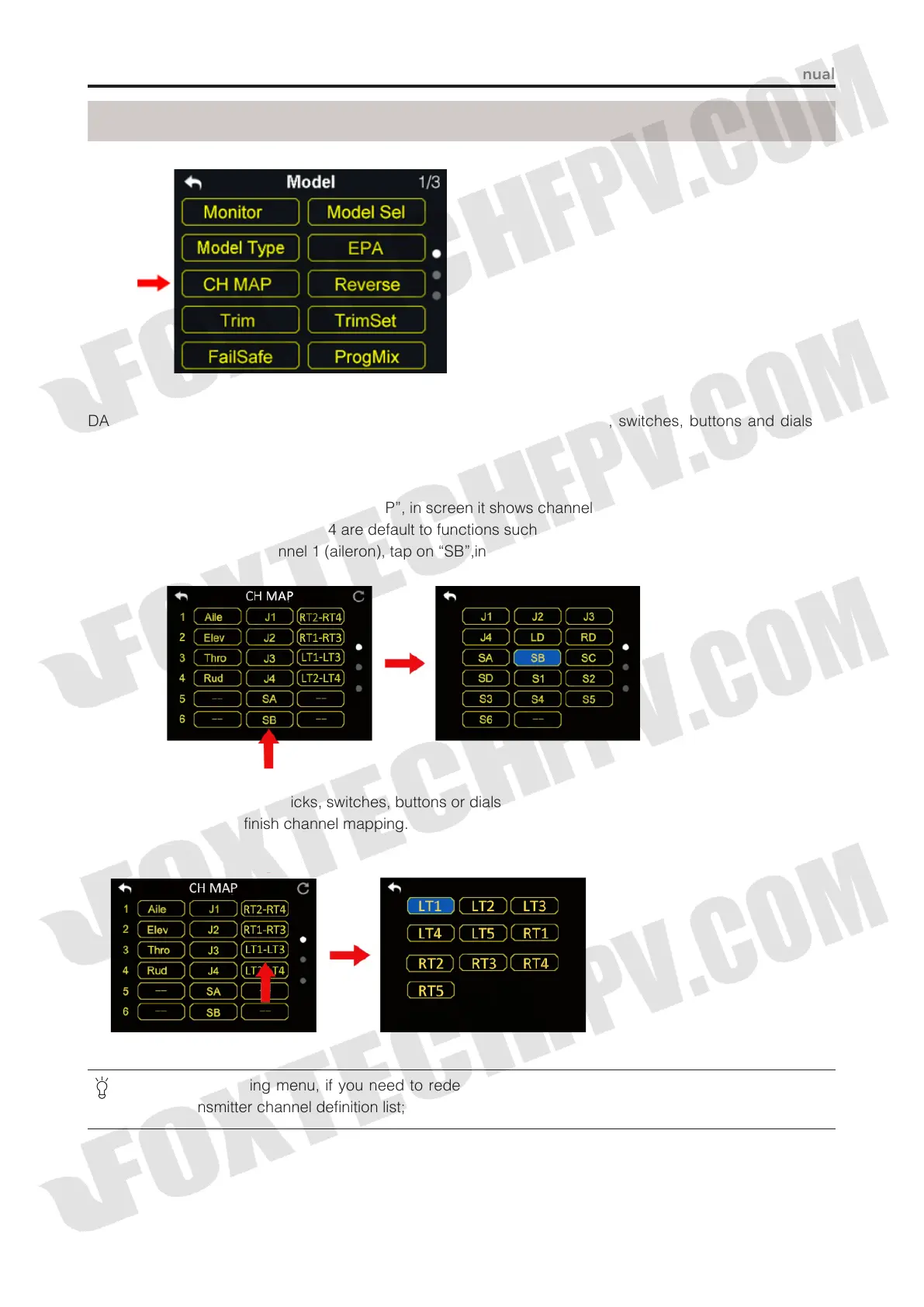 (1) In model settings menu, tap on “CH MAP”, in screen it shows channel mapping menu;