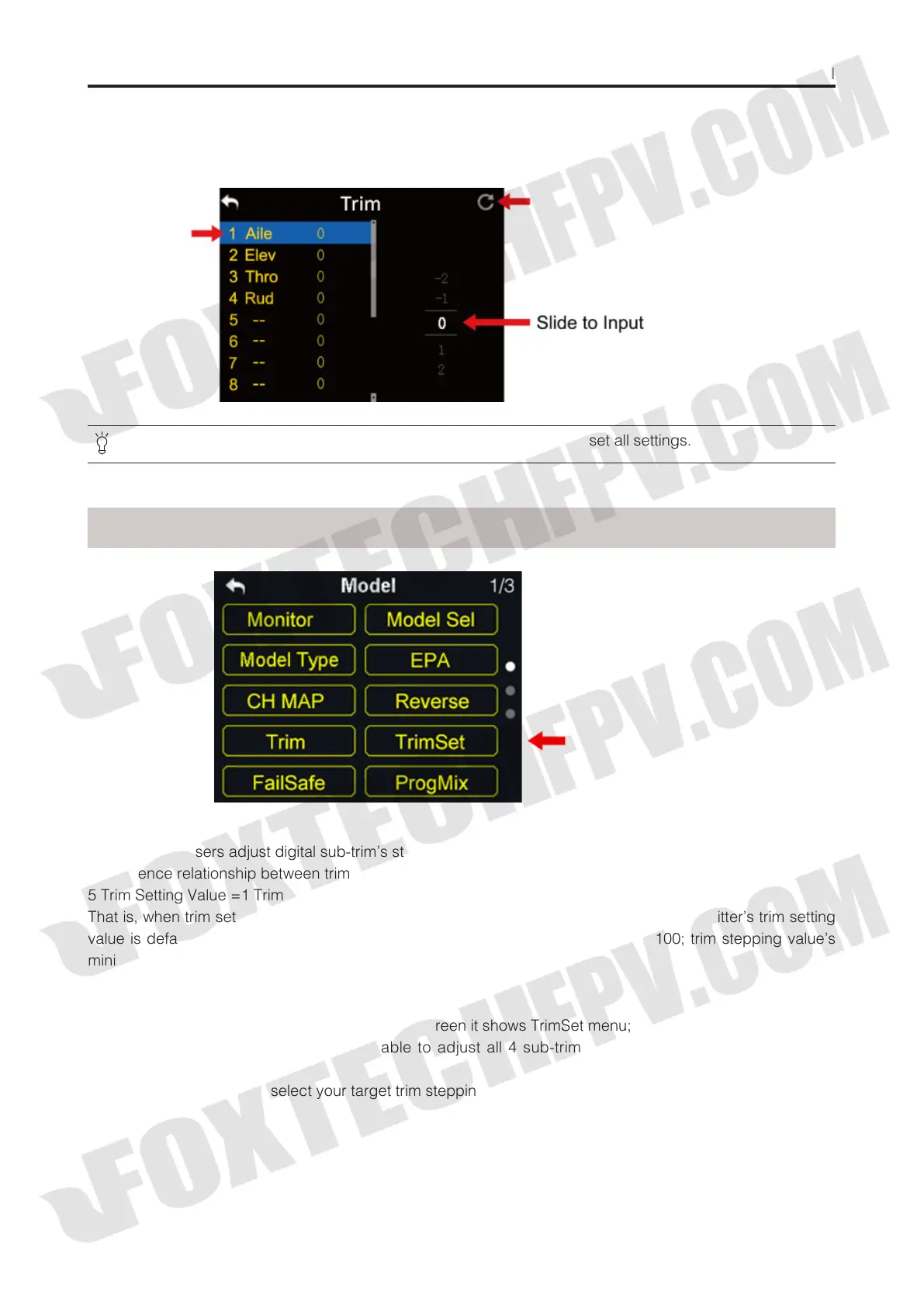 (1) In model settings menu, tap on “TrimSet”, in screen it shows TrimSet menu;