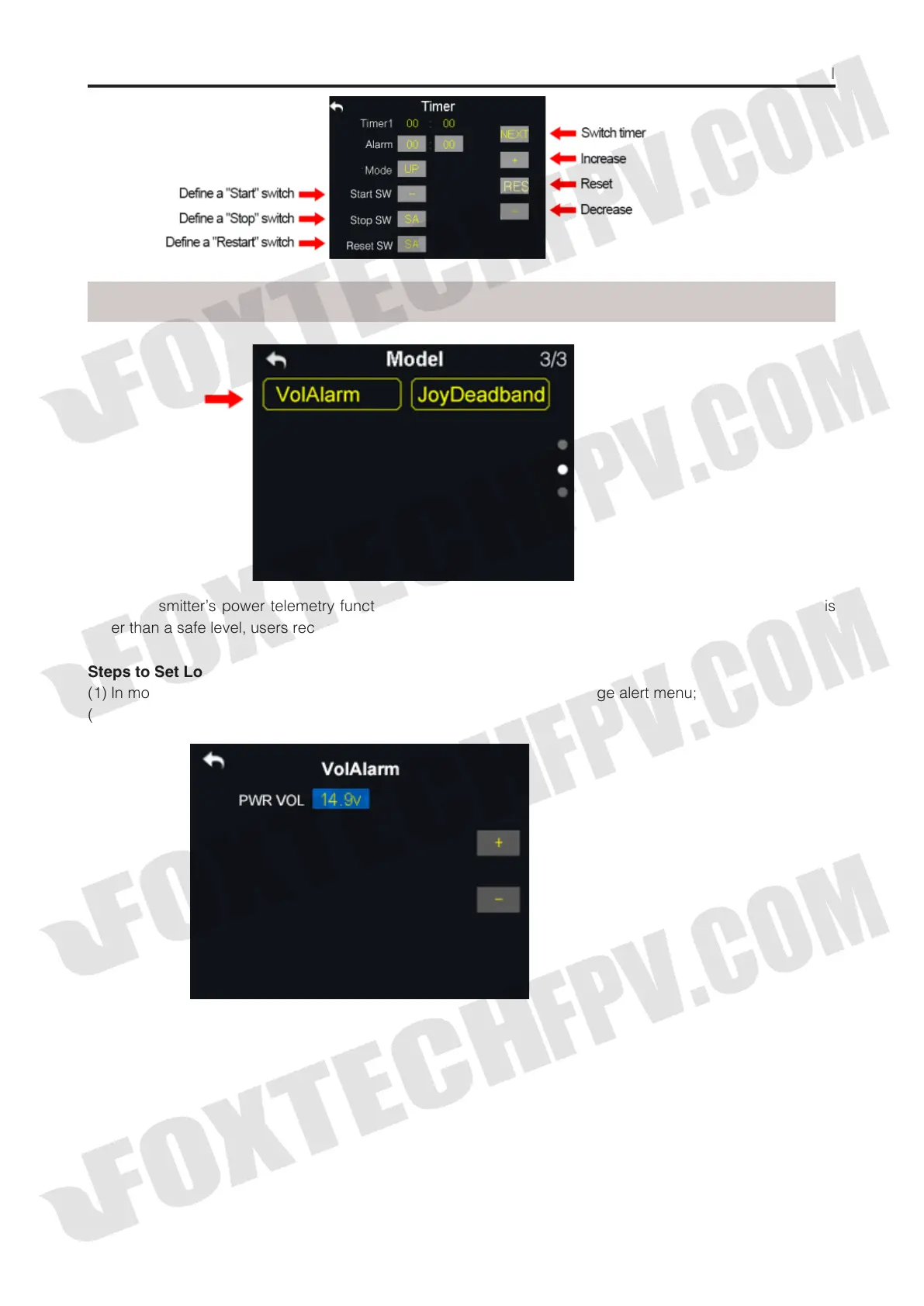 (1) In model settings menu, tap on “LowVol Alert”, in screen it shows voltage alert menu;