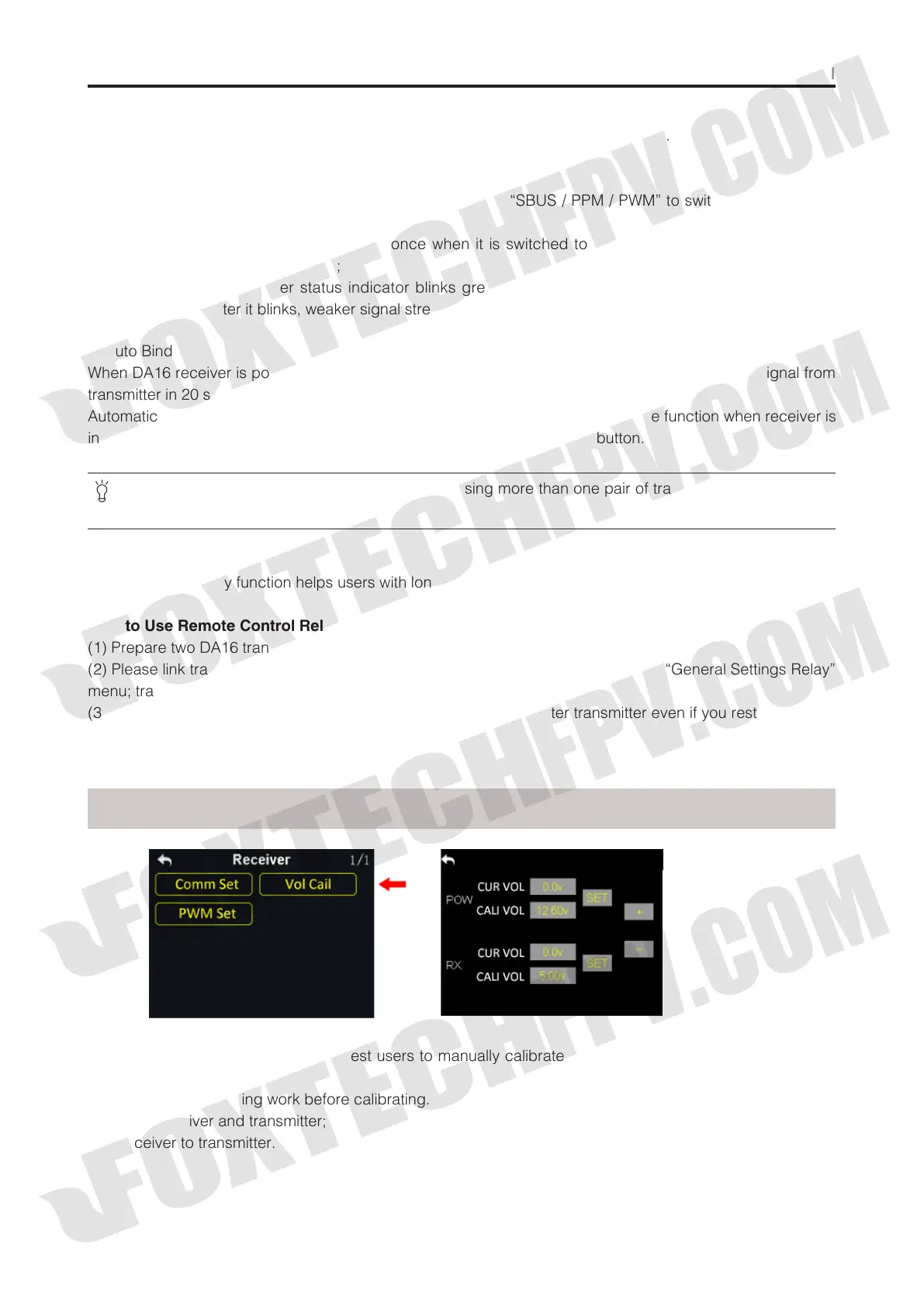 Before using DA16 receiver, we suggest users to manually calibrate receiver telemetry voltage and aircraft