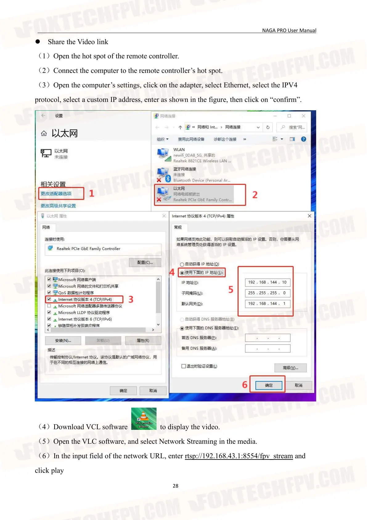 (6)In the input field of the network URL, enter rtsp://192.168.43.1:8554/fpv_stream and