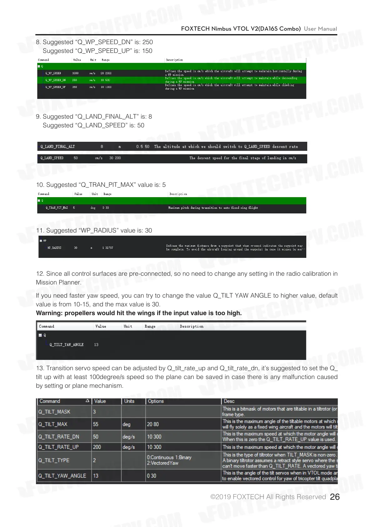 13. Transition servo speed can be adjusted by Q_tilt_rate_up and Q_tilt_rate_dn, it’s suggested to set the Q_