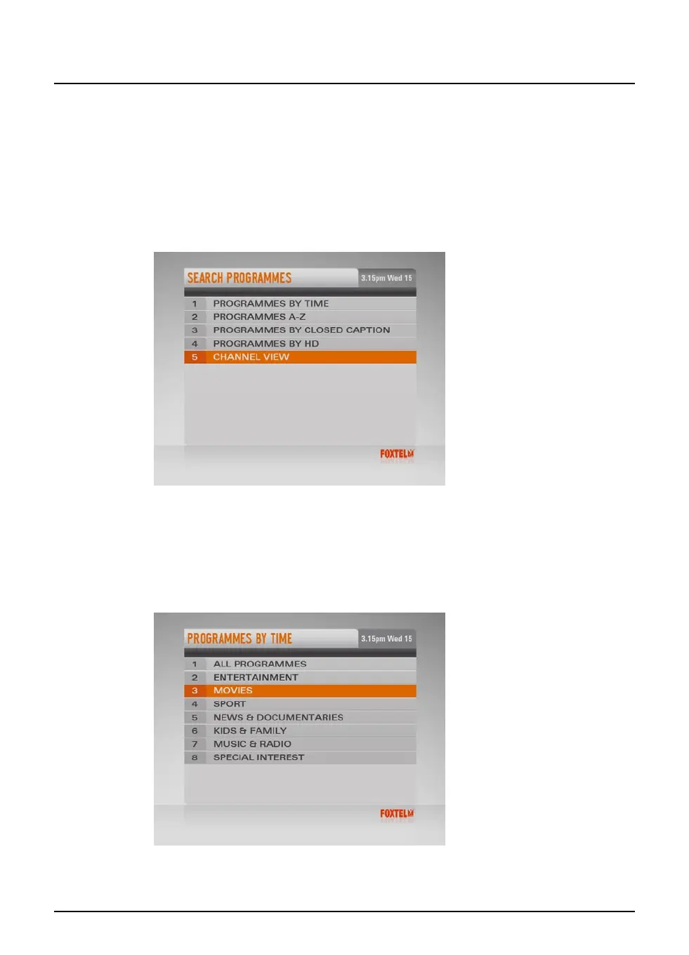 u To choose a programme by time, highlight ‘Programmes By