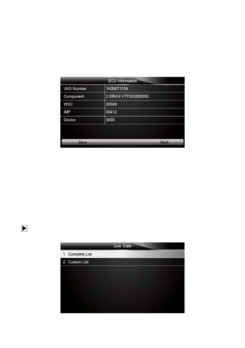 3. Press function key Save to store ECU information. Or use the BACK key to exit.
