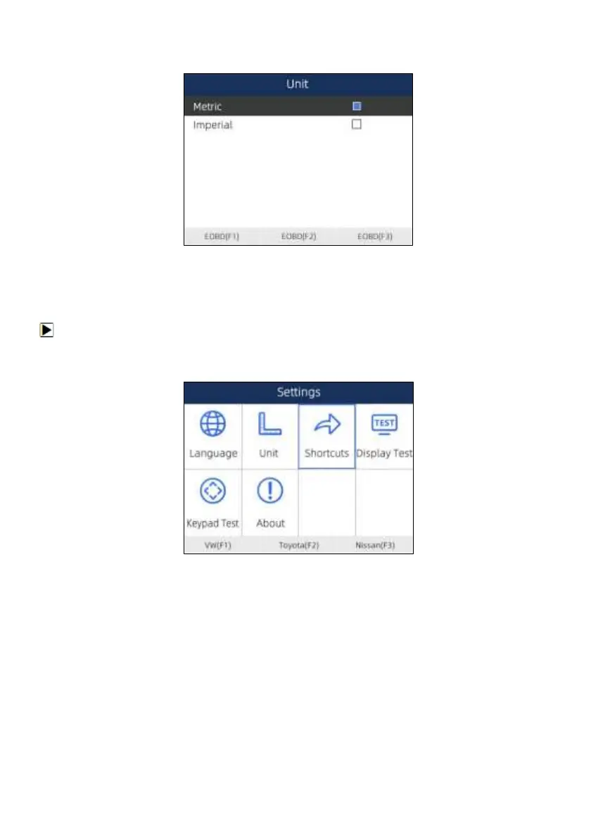 2. Press the up and down arrow key select a shortcut key and press the ENTER key. A screen with a