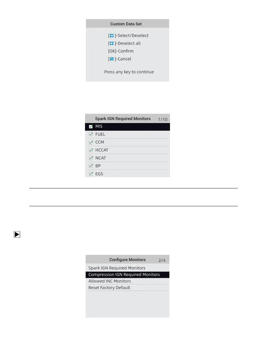 In this menu, the operators can configure monitors for compression ignition cars (diesel engines).