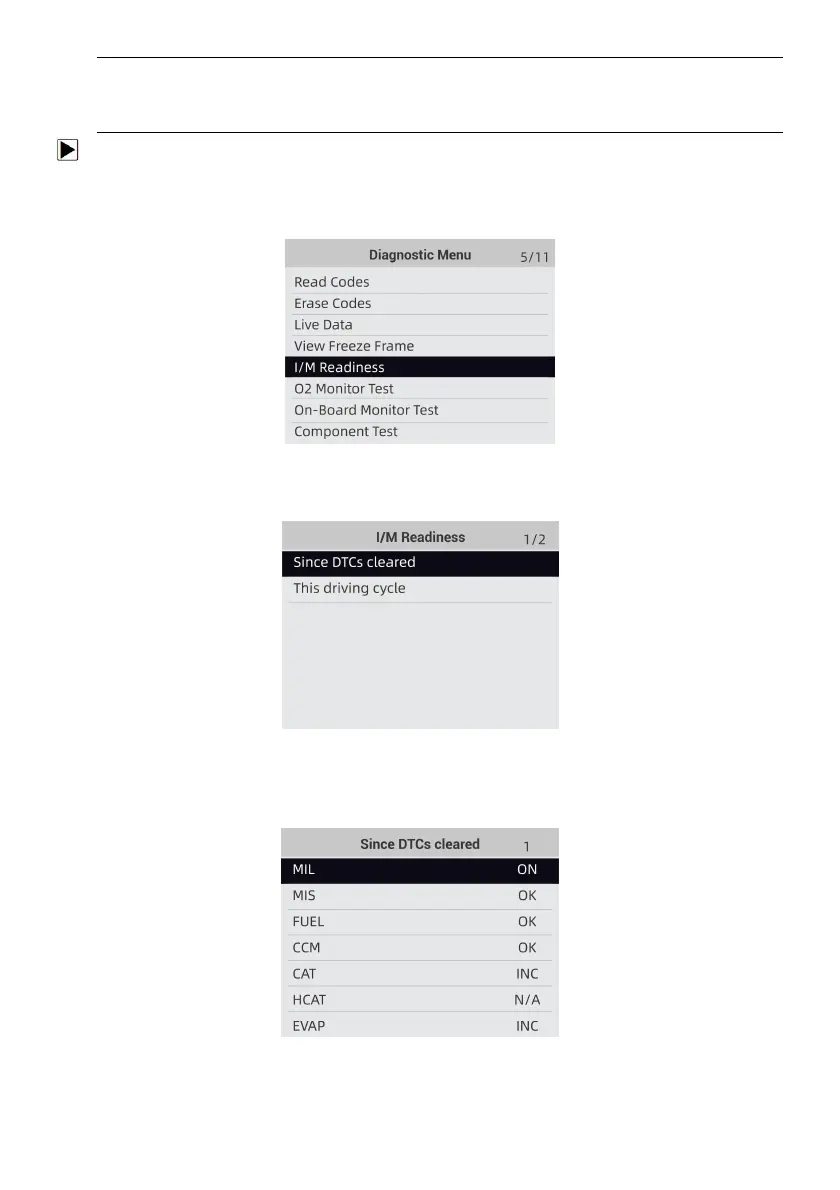 1. Scroll with UP/DOWN key to highlight I/M Readiness from Diagnostic Menu and press the