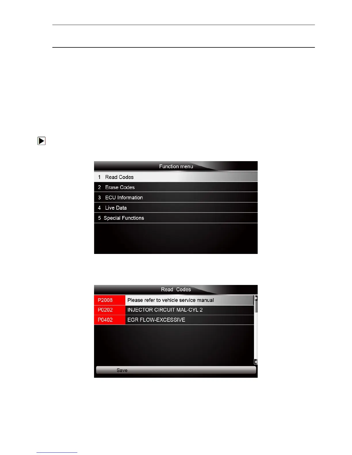 3. Press function key Save to store DTC information. Or use the BACK key to exit.