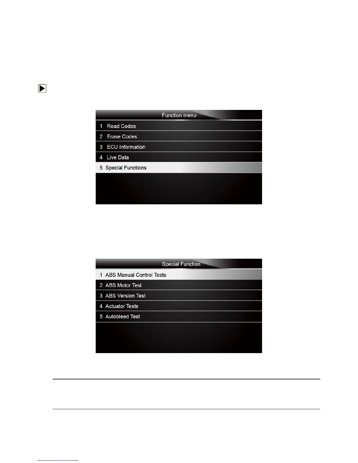 1. Scroll with the arrow keys to highlight the special function test you want to perform from the