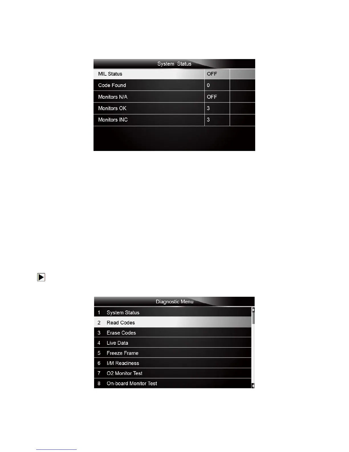 1. Scroll with the arrow keys to highlight Read Codes from Diagnostic Menu and press the