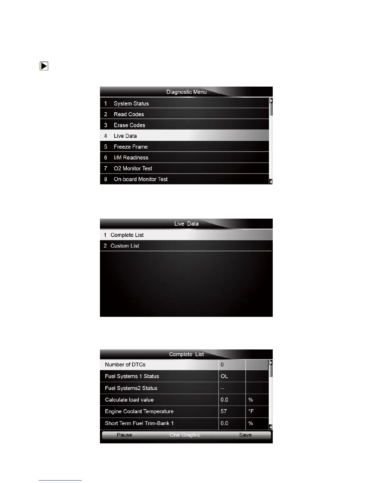 1. Scroll with the arrow keys to highlight Live Data from Diagnostic Menu and press the ENTER