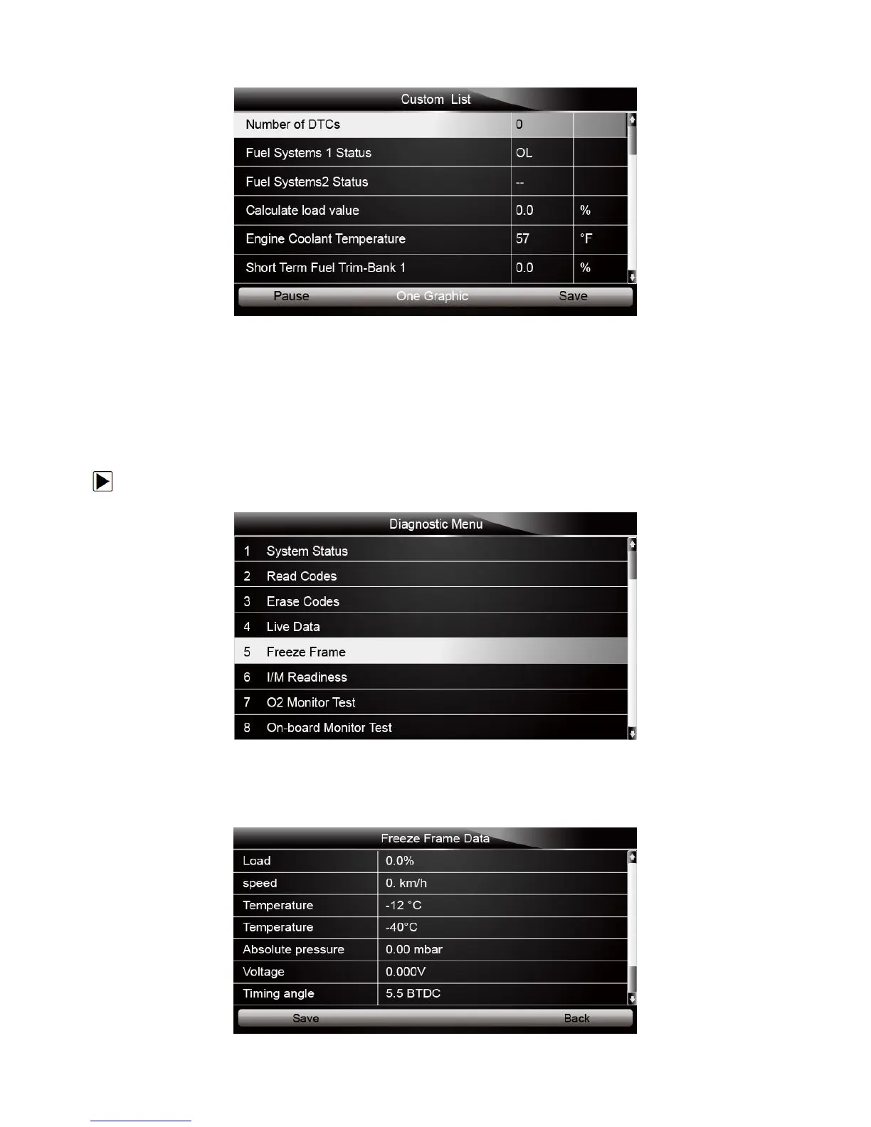 keys to scroll back and forth through different screens of data. If no freeze frame detected, the